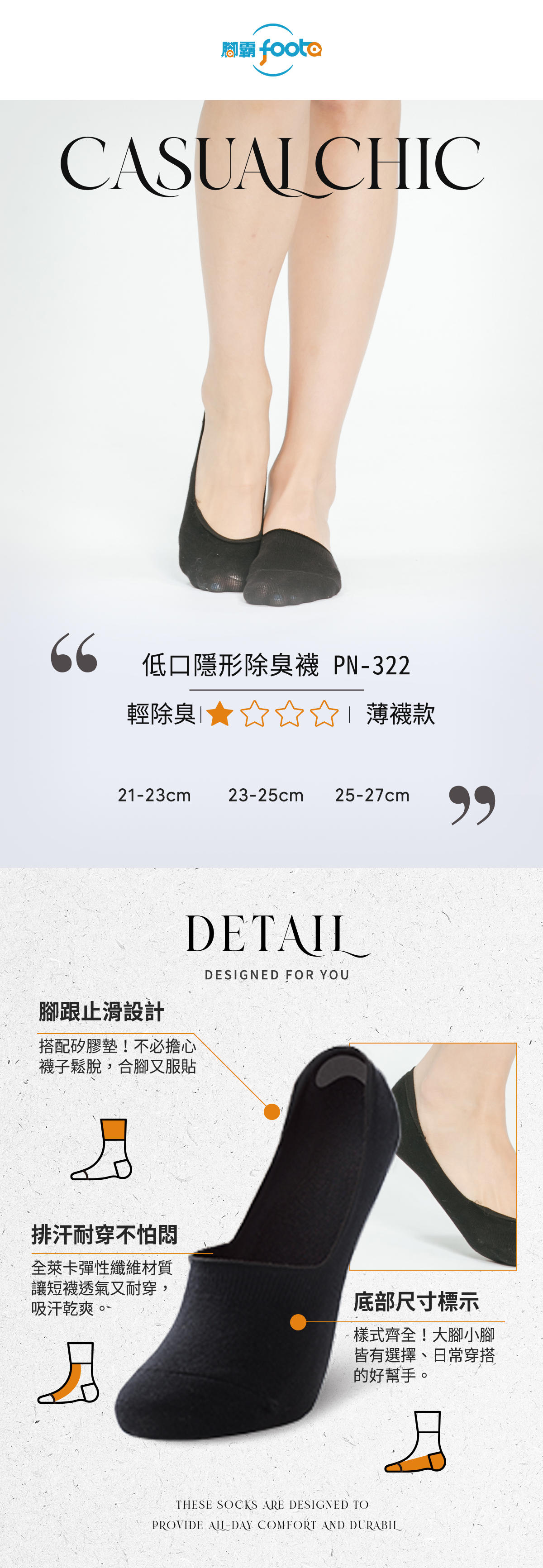 A. 腳霸的每一雙襪子,雖然都是除臭襪,卻會因為吸汗能力不同,除臭效果也會有差別!腳霸特別將每雙襪款分為「四個除臭等級」,讓你能一眼看出每雙襪款的除臭力是不是能滿足你的需要!而「輕除臭襪款」的特性是屬於「最薄的薄襪款」,能吸收的汗水有限,適合日常穿搭使用,如果你想選擇這雙襪款,又有比較強的除臭需求,請一定要搭配「除臭鞋墊」使用喔!